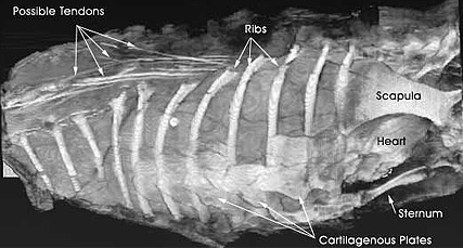 April 30, 2000 Raleigh, North Carolina - There was an astonishing discovery in the Hell's Creek sandstone of northwestern South Dakota back in 1993: a 13 foot long dinosaur with a heart in its rib cage. It's all fossilized, of course, but now modern CT scanning technology has confirmed it's four chambered with one aorta like warm-blooded animals today, not the cold-blooded reptilian metabolism assumed for dinosaurs over the past 150 years.
