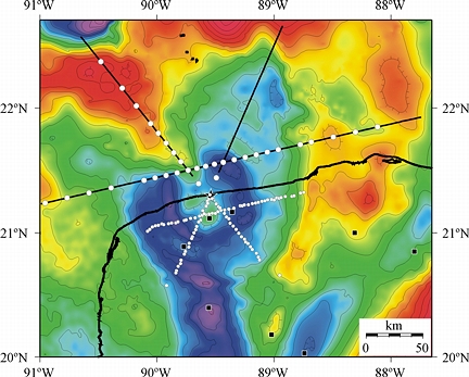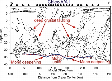January 7, 2001 Austin, Texas - Sixty-six million years ago more than 75% of all living earth creatures died. It was the end of a warm period called Cretaceous and the beginning of another named Tertiary. At that "K-T boundary," as scientists call it, there was a major, worldwide change that exterminated the dinosaurs. Experts have argued about the cause of the global extinction for at least two centuries. Twenty years ago physicist Luis Alvarez and his geologist son, Walter, reported the discovery of a worldwide layer of clay that has a high iridium content right at the K-T boundary layer in the earth's crust. Iridium is rare on earth, but abundant in some comets and asteroids, so the Alvarez team theorized that a comet or large asteroid must have hit the earth. When scientists looked for the greatest concentration of iridium, the data took them to the northwestern corner of the Yucatan peninsula in the Gulf of Mexico. There they found the massive 60-mile wide underwater crater called Chicxulub now thought to be the impact site.
