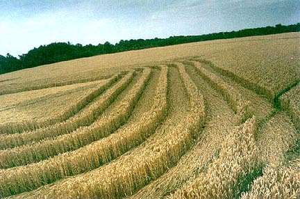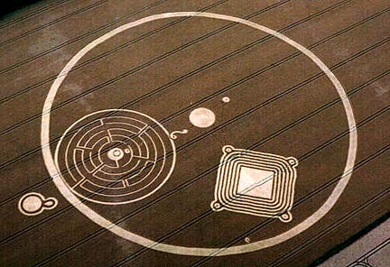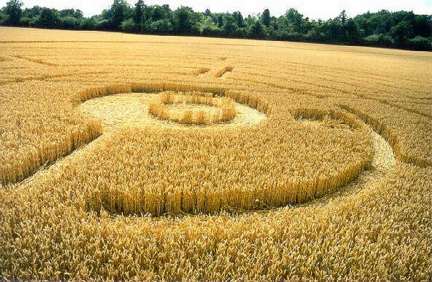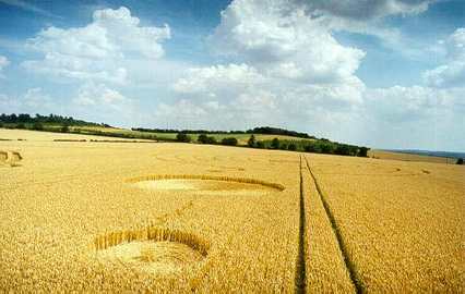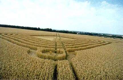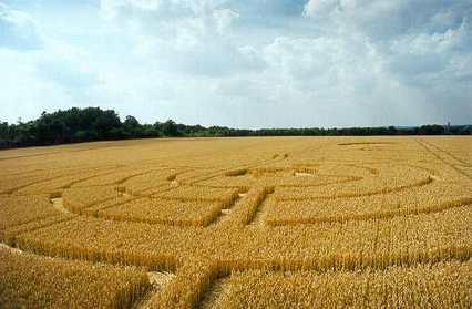 September 18, 2001 Gog Magog Hills, Cambridge, England - Two months to the day before the horrorific attacks on New York City's World Trade Center, the Pentagon in Washington, D. C. and the airliner over Shanksville, Pennsylvania, an unusual series of evolving crop formations occurred in wheat at the Gog Magog Hills southeast of Cambridge, England near an ancient Neolithic circle of stones called Wandlebury Ring.