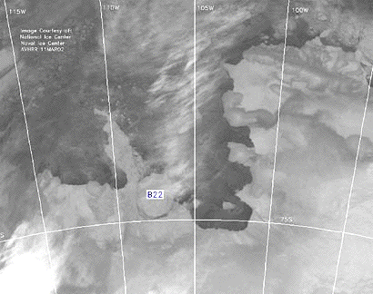 March 21, 2002 Boulder, Colorado - Scientists have been warning since 1997 that the Antarctic Peninsula and its Larsen B ice shelf were melting, but no one expected that by March 2002 the Larsen B would have disintegrated to only 40% of the size it was five years ago. But it has and in its collapse, one of the largest floating ice masses of the past thirty years has broken off. Nearly twice the size of Rhode Island covering 2,160 square miles (3,250 square kilometers) and 750 miles thick, iceberg B-22 was photographed on March 11, 2002 by the AVHRR satellite and reported by NOAA, the National Ice Center (NIC) and the University of Colorado's National Snow and Ice Data Center. The ice shelf has existed since the last ice age 12,000 years ago, and yet it disintegrated suddenly over a 35 day period that began the end of January 2002.