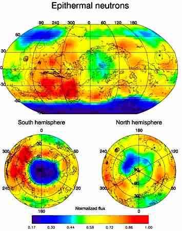June 1, 2002 Pasadena, California - Since NASA's 1976 Viking missions, Mars has been thought by most people to be dry, dusty and dead, marked with ancient river channels and gullies that meant water had been there once upon a time. For several decades, traces of atmospheric water and some water ice along with frozen carbon dioxide at the poles had been known. But where had all the water gone that had once flowed through the rivers and canyons? Apparently, the oxidized, rusty surface has been deceiving. Less than a meter below the red rocks and dust in very cold regions, scientists have found a signal for the element hydrogen that is so strong it's assumed to be frozen H2O (water), according to this week's journal Science.