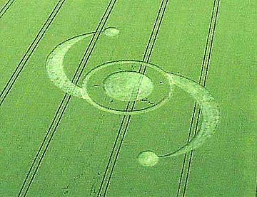 June 4, 2002 Avebury Trusloe, Wiltshire, England - For days prior to Saturday, June 1, rain had been falling hard on the crops in the famous farm county of Wiltshire, England. Then between the night of June 1 and 6 a.m. June 2, something touched young, green, 4-foot-high barley growing in a field near the famous and ancient ring of large sarsen granite stones in Avebury. The farm owner, a Mr. Butler, said he knew the barley was normal the day of June 1, so he was surprised and amazed to find a 180-foot-diameter formation of most intricate design at 6 a.m. on Sunday morning. According to Mr. Butler and a couple of other people who came along, the pattern was in pristine condition. No one could find tracks or other evidence of entry in the wet, rain-soaked mud.On June 2nd, Charles Mallett - new owner with his wife, Frances, of the Silent Circle Cafe in Cherhill not far from Avebury - heard about the new formation and went to see it. Charles has been in dozens of crop patterns and later talked with me by phone about his impressions.