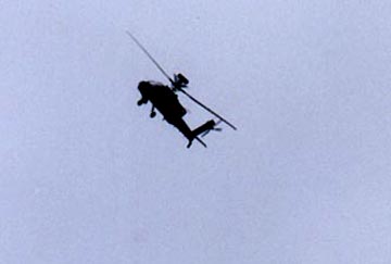 Yeah. Well, I’ve observed these two Apaches flying around here for at least the last three weeks (in July 2003), usually in pairs. I also filmed one of the Apache helicopters hovering over a crop formation near Tan Hill for nearly five minutes which I filmed. It was obvious that he was observing the crop formation at Huish, the people in the formation and me as well. I was on the side of the hill. He did the same thing and circled over my head.