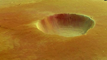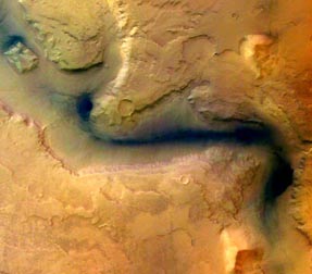 January 31, 2004 Darmstadt, Germany - The European Space Agency's Mars Express Orbiter has been exploring the red planet from 186 miles (300 kilometers) altitude. Its high resolution stereo camera has been sending back extraordinary color images. Some, like the Gusev crater image above, show green areas. Some like the Reull Vallis ancient river channel below show blue and blue-green regions.