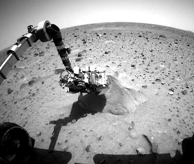 NASA's Mars Opportunity rover rolled out of its lander in the Meridiani Planum at 3:01 a.m. PST on January 31, 2004. Image credit: NASA/JPL/Cornell University.