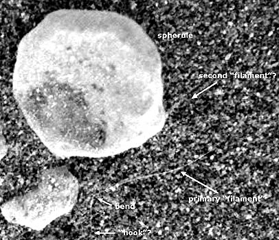 The upper arrow points at the end of a filament that starts at the spherule, appears to go under the soil grains and reappears near the upper arrow. The lower arrow points at a filament that bends. For size context, each of the pebbly grains below the larger round spherule and other rocks is about 100 to 200 microns in diameter, about the size of a sugar grain. So the two long, unidentified filaments laying on the little soil grains are about 1 to 2 microns in diameter. Source of image: Opportunity Microscopic Imager Non-linearizedFull frame EDR acquired on Sol 19 (February 12, 2004) of Opportunity's mission to Meridiani Planum at approximately at approximately 11:25:52 Mars local solar time, Microscopic Imager dust cover commanded to be OPEN. Image credit: NASA/JPL/Cornell/USGS.