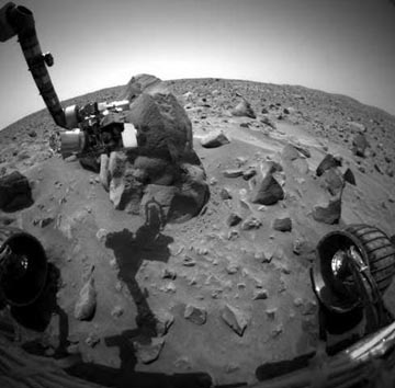 March 1, 2004 Pasadena, California - Nasa reports that the Spirit rover: "...used its rock abrasion tool for brushing the dust off three patches of a rock named "Humphrey," during its 55th sol on Mars, ending at 5:53 p.m. Saturday, PST. Before applying the wire-bristled brush, the rover inspected the surface of the rock with its microscope and with its alpha particle X-ray spectrometer, which identifies elements that are present. Brushing three different places on a rock one right after another was an unprecedented use of the rock abrasion tool, designed to provide a larger cleaned area for examining.