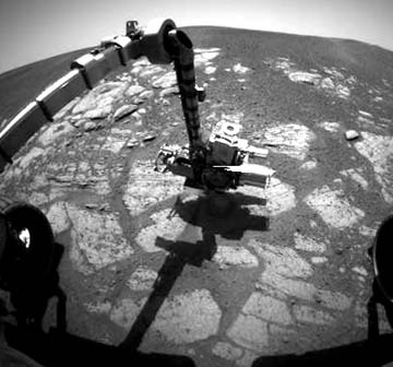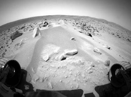 Left photo: Reversed 180 degrees from images posted at NASA website in right photo. Taken by Spirit rover Microscopic Imager Non-linearized full frame EDR acquired on Sol 65 of Spirit's mission in Gusev Crater at approximately at approximately 11:21:10 Mars local solar time. Images credit: NASA/JPL/Cornell/USGS. To see original images, go to sol 65: http://marsrovers.jpl.nasa.gov/gallery/all/spirit.html
