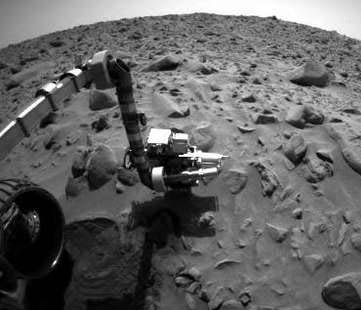 Spirit rover brushed off dust in semi-circle, taken by Right Panoramic Camera Non-linearized Sub-frame EDR acquired on Sol 65 of Spirit's mission to Gusev Crater at approximately 11:43:43 Mars local solar time, camera commandedto use Filter 1 (719 nm).
