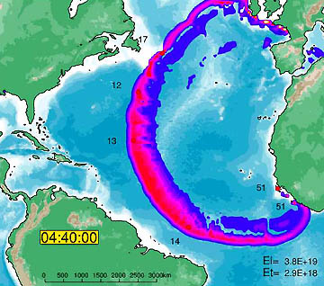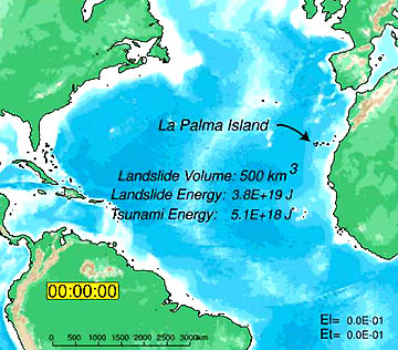 January 21, 2005 Santa Cruz, California - The seven Canary Islands owned by Spain rise above the Atlantic Ocean west of Morocco, Africa. One of them, La Palma, is not only the steepest island in the world, but has also been the most volcanically active of the Canaries in the past 500 years. On it is the 4-mile high volcano called Cumbre Vieja, which means "Old Summit." The volcano has been re-building itself for the past 15,000 years since it last blew apart and collapsed huge amounts of rock into the surrounding ocean, sending out a giant tsunami that has been detected in deposits as far away as the Bahamas and Bermuda. Over the past 15,000 years, the volcano kept erupting under water, building back up from the Atlantic sea bed three miles below the water surface to its present height, which is now more than a mile above the Atlantic. Its last two eruptions were 1971 and 1949.