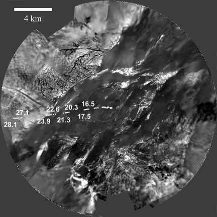 May 6, 2005 Tucson, Arizona - This week planetary scientists at the University of Arizona in Tucson submitted their first paper about the Cassini/Huygens probe images of Saturn's huge moon, Titan, to the British journal, Nature. But the article, with many images and hypotheses about what the surface geology might be on the mysterious moon, won't be released until the end of 2005. One of the many surface features that have provoked scientists to wonder what they are seeing is what appears to be a straight-sided 90-degree angle at the left of a composite image released on January 14, 2005, soon after the Huygens probe had descended from the Cassini spacecraft to land on Titan. This week I asked one of the team members studying Titan's surface images to comment on the "structure."