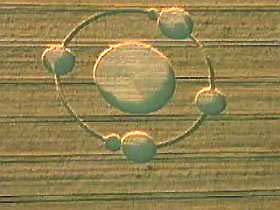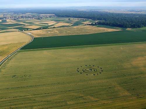 June 18, 2007 Ljutomer, Slovenia - On Wednesday, June 13, 2007, a crop formation of 18 larger circles "strung on" three rings, plus a very small 19th circle on a small fourth ring orbiting one of the larger circles, appeared near Krapje at Ljutomer, Slovenia, about 984 feet (300 meters) from where a crop pattern appeared in 2006. The 2006 formation had six circles on a ring surrounding a large central circle.