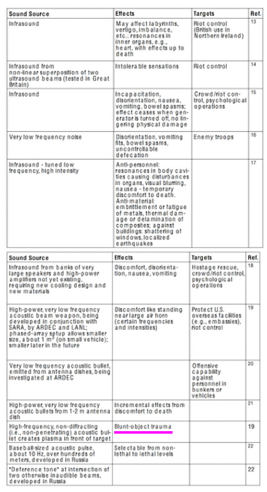“Human hearing range is 20 Hz to 20,000 Hz. Below 20 Hz down to 4 Hz is infrasound. Above 20,000 Hz is ultrasound. Infrasound is usually not perceived as a tonal sound, but rather as a pulsating sensation, pressure on the ears or chest. Ultrasound can cause ear pressure, headaches, nausea and fatigue. Microwaves are electromagnetic waves with frequencies ranging from 300 MHz to 300 GHz.” - Assoc. of Veterans Administration Audiologists (AVAA), March 2010