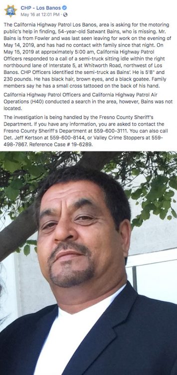 “The Merced County Sheriff's Office has confirmed the body of 56-year-old Satwant Bains, missing truck driver, is the one found in the Delta-Mendota canal.”
