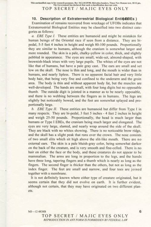“Examination of remains recovered from wreckage of UFOBs indicates that Extraterrestrial Biological Entities may be classified into two distinct categories as follows:  a. EBE Type I. and EBE Type II.