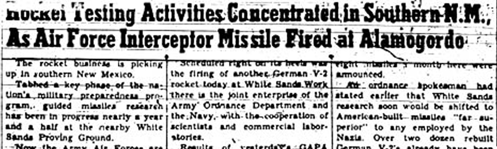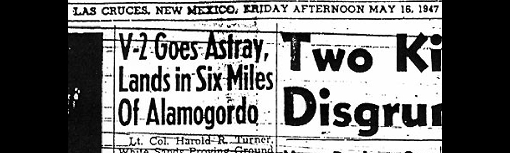 "Lt. Col. Harold R. Turner, White Sands Proving Ground commanding officer, today blamed 'peculiar phenomena' for the erratic test flight of a German V-2 rocket which landed only six miles east of Alamogordo yesterday afternoon."